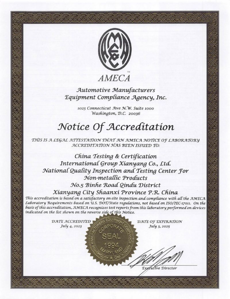 我公司是美国AMECA(DOT) 认证机构授权的第三方指定实验室。也是中国汽车用制动衬片强制认证指定实验室,巴西、海湾等多个国家的指定实验室。认证检测业务广泛分布于中国及欧洲、澳洲、美国、日本、印度等地区和国家。