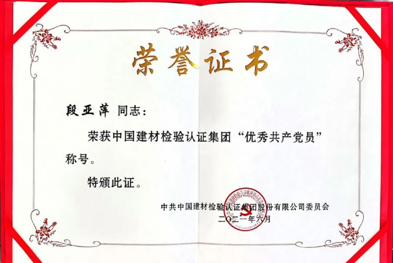 同时我支部段亚萍同志荣获中共国检集团党委“优秀共产党员”荣誉称号。