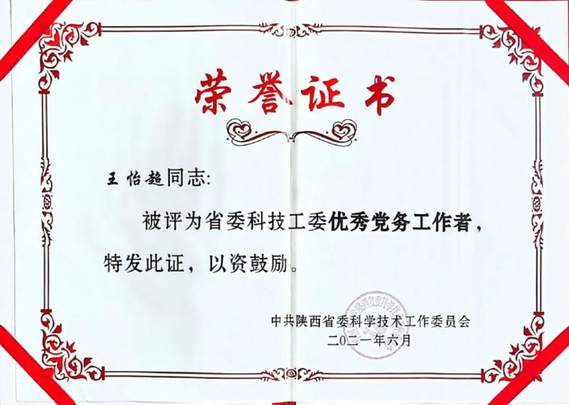 2021年06月30日中共陕西省委科学技术工作委员会在陕西省科技资源统筹中心召开庆祝建党100周年暨“七一”表彰大会,国检集团(CTC)咸阳公司党支部荣获省委科技工委“先进基层党组织”,我支部组织委员王怡超荣获“优秀党务工作者”。