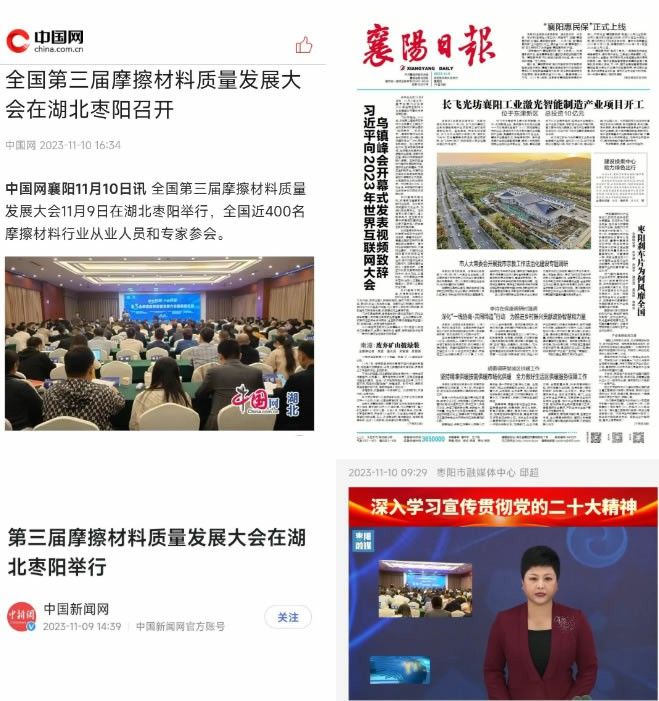 中国网、中国新闻网、湖北日报、襄阳广播电视台等十余家主流媒体对本届会议进行了多层次、多声部的深度报道。本届会议广泛深入的交流分享了摩擦材料产业链最新研究成果,提供了相互学习、拓展业务的舞台,明确了“科技创新 产业升级”的方向和目标,坚定了攻坚克难、砥砺前行的信心,受到了摩擦材料行业的充分肯定和广泛好评。中国国检测试控股集团咸阳公司将一如既往弘扬“守正创新 追求卓越”的发展理念,更好的服务企业、贴近企业,推动摩擦材料行业技术进步和高质量发展。