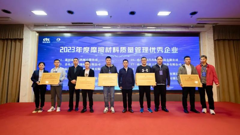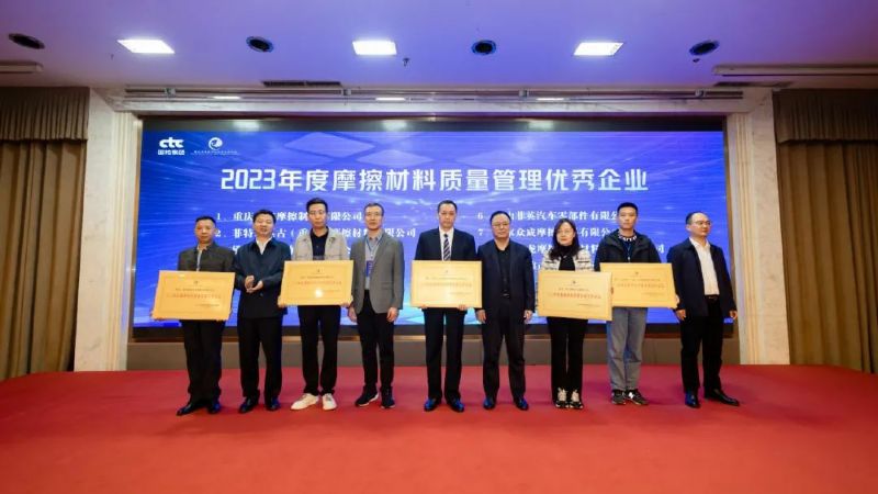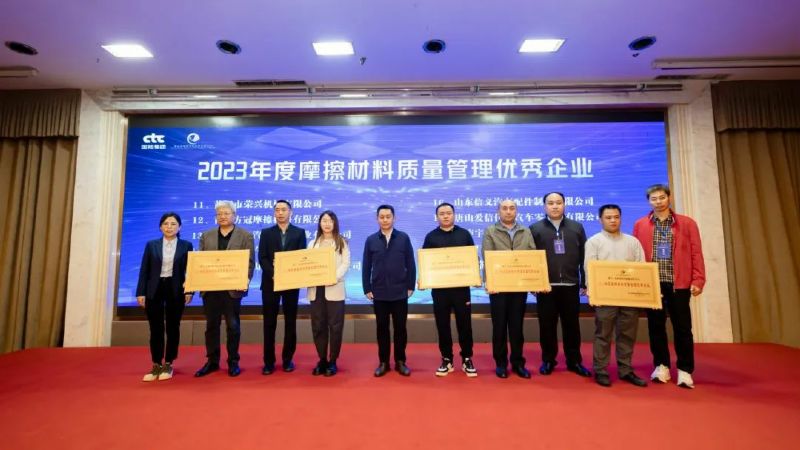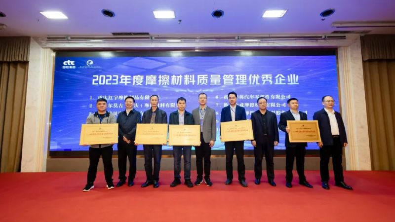 会上,由中国汽车工业协会制动器委员会荣誉秘书长、2023年度摩擦材料质量管理优秀企业评审委员会主任委员顾一帆宣读了《关于表彰2023年度摩擦材料质量管理优秀企业决定》,随后枣阳市人民政府副市长聂荣毅,咸阳非金属矿研究设计院有限公司党委书记、董事长杨智荣,襄阳市市场监管局二级调研员林江华等领导和嘉宾为重庆红宇摩擦制品有限公司等20家企业颁发了奖牌。