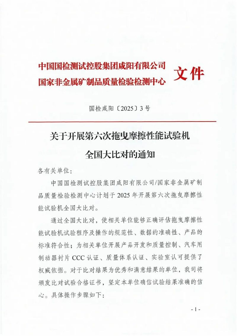 中国国检测试控股集团咸阳有限公司/国家非金属矿制品质量检验检测中心计划于2025年开展第六次拖曳摩擦性能试验机全国大比对。