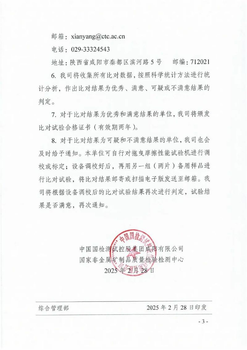 8. 对于比对结果为可疑和不满意结果的单位,我司也会及时给予通知。本单位可自行对拖曳摩擦性能试验机进行调校或标定;设备调校好后,再用另一组(两片)备用样品进行比对试验,将比对结果邮寄或扫描电子版发送至邮箱。我司将根据设备调校后的比对试验结果再次进行判定,试验结果是否满意,再次通知。