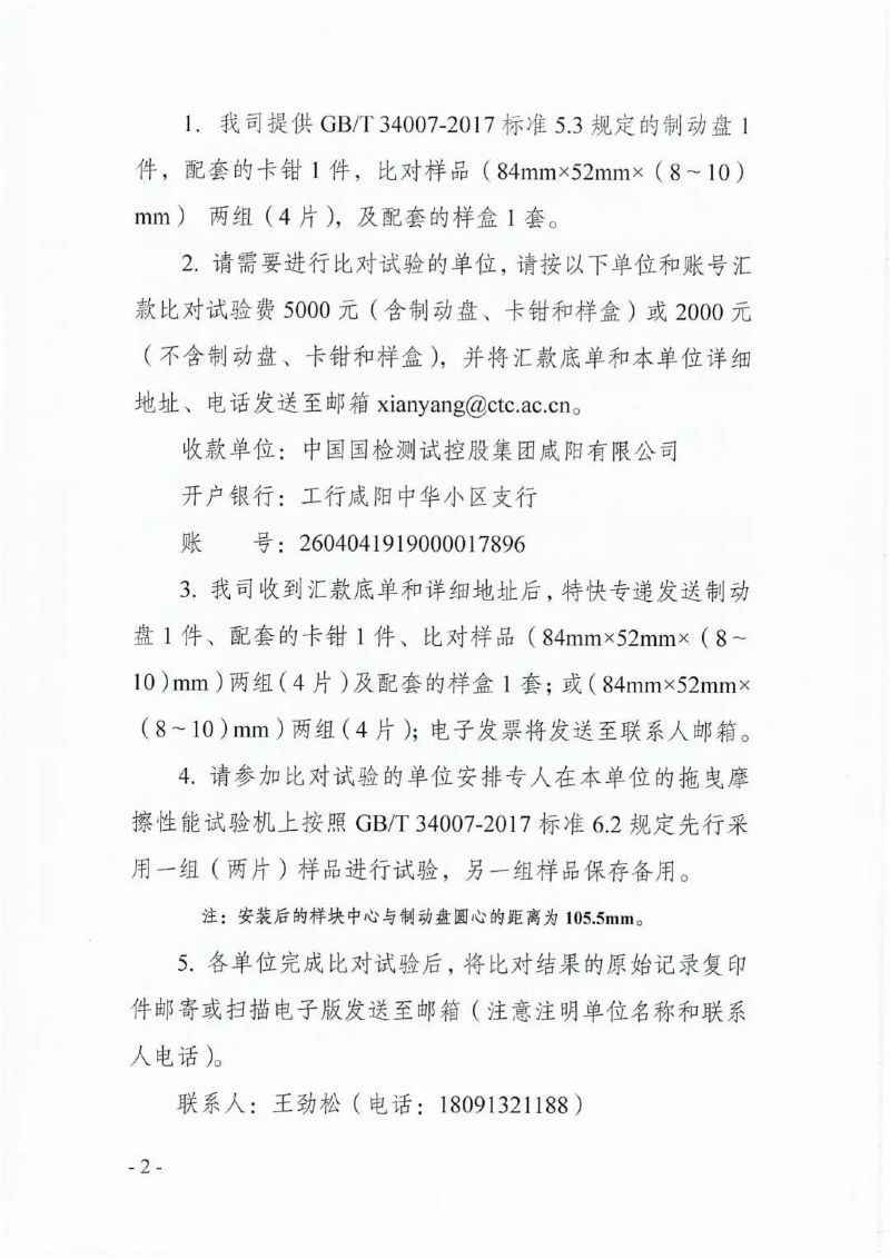2. 请需要进行比对试验的单位,请按以下单位和账号汇款比对试验费5000元(含制动盘、卡钳和样盒)或2000元(不含制动盘、卡钳和样盒),并将汇款底单和本单位详细地址、电话发送至邮箱xianyang@ctc.ac.cn。
