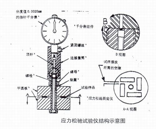 本试验机利用螺栓加载对夹在两圆板之间的垫片材料进行应力松弛试验。因此,这种测试方法更接近垫片材料的实际受力情况,仪器的结构如图所示。将待测试的垫片材料 (例如石棉橡胶板) 放置在两个圆形板之间。加载螺栓穿过两个圆板之间,拧紧加载螺栓压缩夹在圆板之间的样品,从而在垫片材料口形成一定的初始比压。经过一定时间后,初始压缩时的初始比压力会下降,并达到一定的比压力值,这就是垫片材料的蠕变松弛现象。材料的蠕变松弛性可以通过比较垫片材料的初始比压值和试验后的比压值的变化来评价。加载螺栓在圆形板和垫片材料上的压力由螺栓的力变形伸长率决定。为了测量螺栓的伸长率,加载螺栓将采用特殊的结构,即在螺栓的中心设置相对固定的心轴。螺栓在受力后被拉长,但内部心轴与螺栓主体分离,因此心轴不会变形和拉长。因此,螺栓的端面将与心轴有一定的相对位移。施加在螺栓上的力可以通过测量在螺栓受力之前和之后心轴的端面与螺栓的端面之间的移动距离来确定 (即,螺栓的伸长率) 通过安装在螺栓末端的千分表。螺栓载荷与伸长率成正比。因此,当螺栓载荷由于衬垫材料的蠕变而减小时,伸长量相应地减小。蠕变松弛率可以表示为: